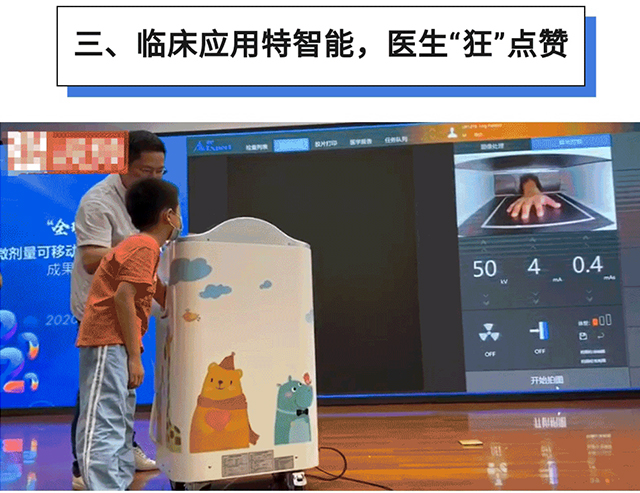據(jù)現(xiàn)場(chǎng)醫(yī)生介紹,該設(shè)備具有微劑量,全屏蔽防護(hù)和AgeExpert?智能骨齡輔助診斷系統(tǒng)等特點(diǎn)。