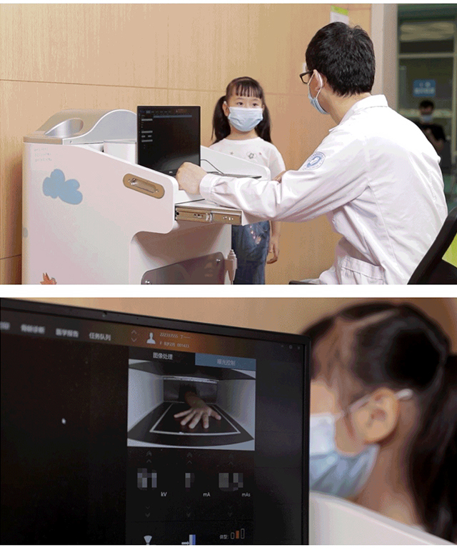 開始檢測(cè)時(shí),醫(yī)生首先打開工作站界面,錄入患者信息,兒童將左手伸入“窗口”內(nèi),醫(yī)生通過屏幕上的軟件界面觀察并實(shí)時(shí)指導(dǎo)兒童手部擺位,按下曝光手閘,屏幕即刻顯示兒童手骨X光圖,圖像清晰細(xì)膩,圖像算法軟件支持圖像后處理、報(bào)告模板編輯功能,最終輸出完整的骨齡診斷報(bào)告。
